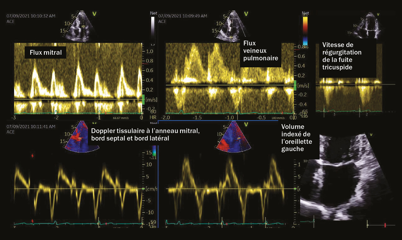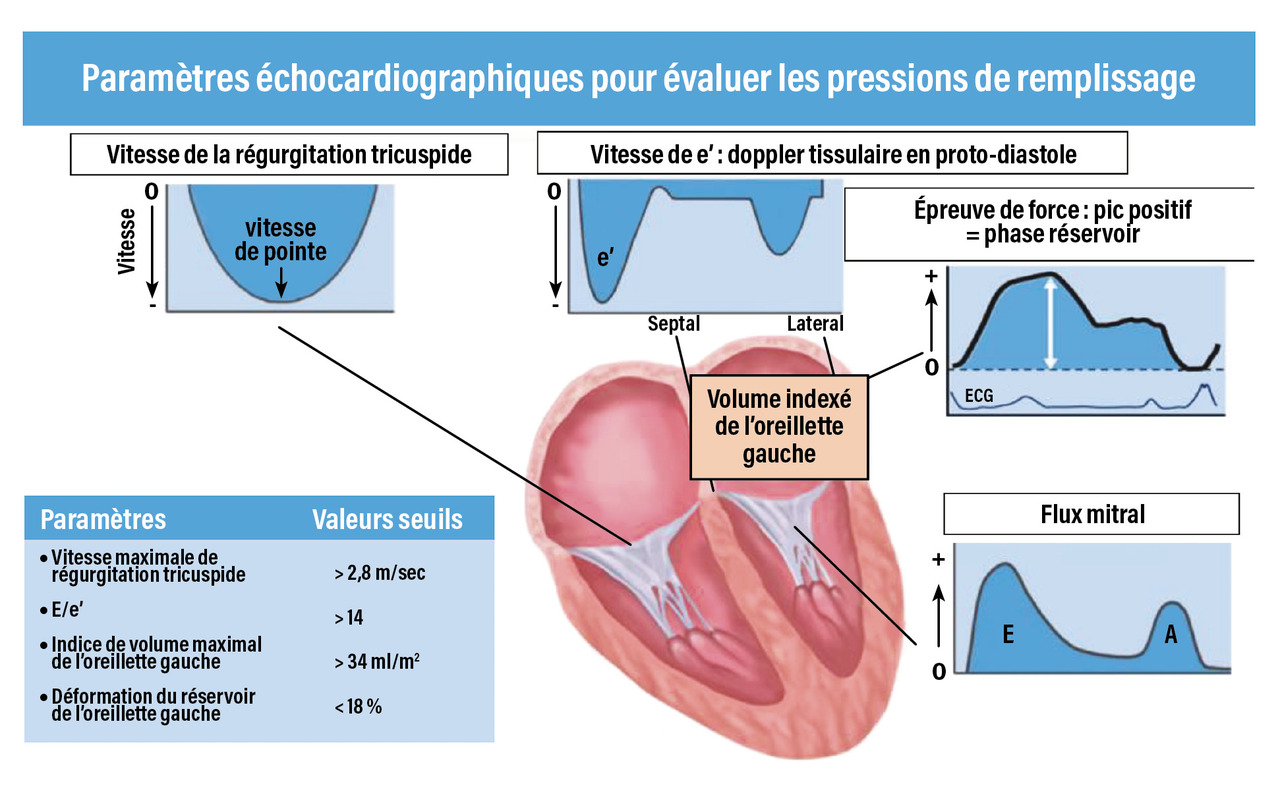 – l’élévation ou non des pressions de remplissage (Vmax de la fuite tricuspide supérieure à 2,8 m/s, E/e’, volume de l’oreillette gauche) ;