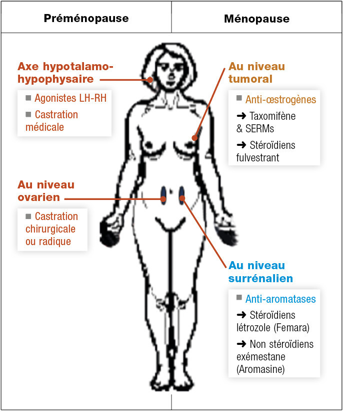 Après la ménopause, les androgènes de production surrénalienne peuvent être transformés en œstrogènes par des aromatases. Ces aromatases sont produites dans les cellules adipeuses. Dans cette situation, le blocage chimique est obtenu par les anti-aromatases (létrozole, anastrozole, exémestane). L’administration se fait par voie orale. Les effets secondaires doivent être anticipés et prévenus (ostéoporose par dépistage et biphosphonate, arthralgies).