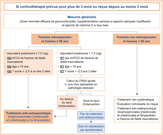 En cas de corticothérapie en cours, le traitement doit être envisagé dès lors que la dose quotidienne de corticoïdes atteint ou dépasse 7,5 mg d’équivalent prednisone et que la durée prévisible de la corticothérapie est supérieure à 3 mois (v. algorithme 2).