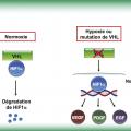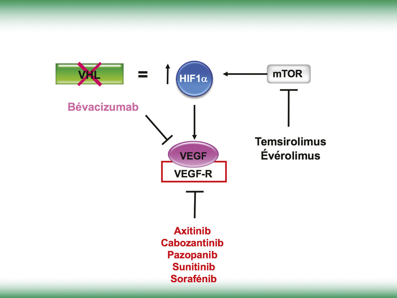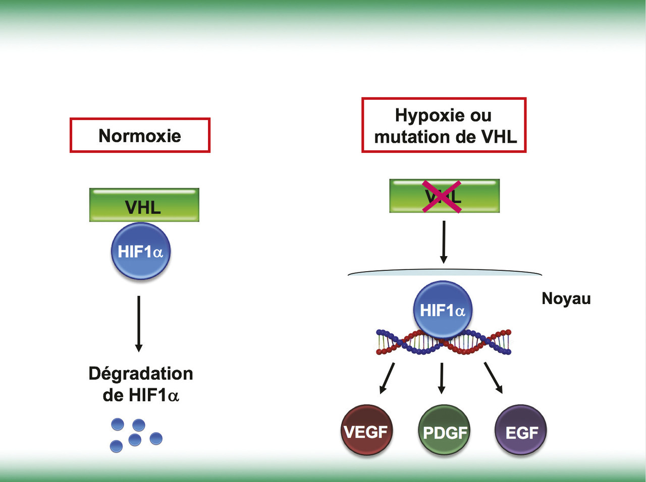 Le cancer du rein à cellules claires est la plus fréquente des variétés histologiques de cancer du rein (80 % des patients). Il est reconnu depuis longtemps comme une tumeur maligne hypervascularisée, suggérant une importante néo-angiogenèse tumorale en son sein. Les mécanismes moléculaires sous-tendant cette observation ont été reliés à la fréquente détection d’une mutation du gène von Hippel-Lindau (VHL), acquise (somatique) chez la majorité des patients. Dans la cellule normale, la protéine pVHL interagit avec un facteur de transcription, l’hypoxia-inducible factor 1α (HIF1α). Dans des conditions de normoxie, l’interaction avec pVHL conduit à l’hydroxylation et la dégradation de la protéine HIF1α (fig. 1). En situation d’hypoxie, ou en cas de mutation de la protéine pVHL dans les cellules tumorales, la protéine HIF1α n’est plus dégradée, migre dans le noyau et initie la transcription de gènes qui codent plusieurs facteurs de croissance impliqués dans l’angiogenèse : le vascular endothelial growth factor (VEGF), le platelet-derived growth factor (PDGF) ou le transforming growth factorα (TGF-α). Par sa liaison au récepteur du VEGF (VEGF-R) sur les cellules endothéliales et les péricytes présentes dans le micro-environnement tumoral, le VEGF représente le principal facteur de croissance impliqué dans les processus de néo-angiogenèse. Parmi les autres voies qui participent également à la néo-angiogenèse, la protéine mTOR (mammalian target of rapamycin) induit également une surexpression de HIF1α et, par son intermédiaire, des facteurs de l’angiogenèse.1