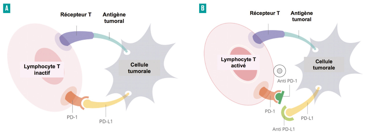 La restauration des défaillances du système immunitaire est une piste thérapeutique envisagée de longue date en cancérologie. L’utilisation de l’interféron alpha et de l’interleukine 2 dans les années 1990 s’inscrivait déjà dans cette perspective, mais avec des résultats décevants. La meilleure compréhension des mécanismes molé- culaires impliqués a permis le développement récent de nouvelles armes thérapeutiques. Les cellules cancéreuses échappent au système immunitaire en inhibant les cellules censées les détruire, et notamment les lymphocytes T. Cette inhibition est réalisée par l’activation de signaux négatifs, physiologiquement présents afin de limiter l’intensité des réactions immunitaires normales mais détournés par les cellules cancéreuses pour induire un état de tolérance à leur égard (fig. 3A). Parmi les nombreux signaux négatifs potentiellement activables par les cellules cancéreuses, la liaison du récepteur PD1 (programmed cell death 1) et de son ligand PD-L1 est responsable d’une inactivation lymphocytaire.3