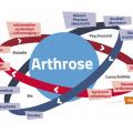 L’arthrose est la plus courante des affections musculo-squelettiques. Sa prévalence clinique augmente progressivement avec l’âge, mais de façon plus importante après 45 ans. Elle est généralement caractérisée par des signes et symptômes facilement identifiables à l’examen clinique : douleur aux mouvements, déformation des extrémités osseuses, gonflement, craquements et limitation de l’amplitude articulaire. La douleur est un élément déterminant dans l’évolution de la maladie. Elle est souvent déclenchée ou accentuée par le mouvement, ce qui peut induire chez le patient arthrosique une kinésiophobie et un comportement d’évitement, tous deux causes de sédentarité et de déconditionnement physique. Ces comportements délétères peuvent à leur tour entraîner de l’anxiété, de la dépression, voire un déconditionnement psychologique et social. Ces facteurs sont autant d’amplificateurs de la douleur chronique qui peuvent plonger le patient dans un cercle vicieux biopsychosocial (v. infra ). Cependant, le modèle biopsychosocial ne suffit pas, à lui seul, à expliquer l’ensemble des phénotypes de la maladie. Récemment, une relation entre le syndrome métabolique et l’arthrose a été démontrée. En effet, le syndrome métabolique dans son ensemble ou ses déterminants pris individuellement (hypertension artérielle, hypercholestérolémie, hyperglycémie et obésité) sont des facteurs de risque de l’incidence et de la progression radiologique de la gonarthrose. Cette relation entre arthrose et syndrome métabolique est à double sens, puisque l’arthrose est une cause de sédentarité, elle-même facteur de risque du syndrome métabolique.2 Cette « découverte » a donné une dimension systémique à la maladie. De plus, l’arthrose contribue à l’inflammation systémique, à bas bruit, associée au vieillissement. Ce phénomène, appelé inflammaging par les Anglo-Saxons, a été identifié comme facteur pathogénique de l’athérosclérose et donc des maladies cardiovasculaires (v. figure ).4, 5 Enfin, la dysbiose (déséquilibre du microbiote intestinal) et l’augmentation de la perméabilité intestinale pourraient favoriser le passage dans le sang de bactéries commensales et de facteurs inflammatoires ensuite véhiculés jusqu’aux articulations.6 Ces découvertes majeures sur la physiopathologie de la maladie ouvrent de nouvelles perspectives de traitement de l’arthrose. Elles justifient une approche holistique du patient inté-grant non seulement le problème articulaire mais aussi les comorbidités et les répercussions psychosociales de la maladie.