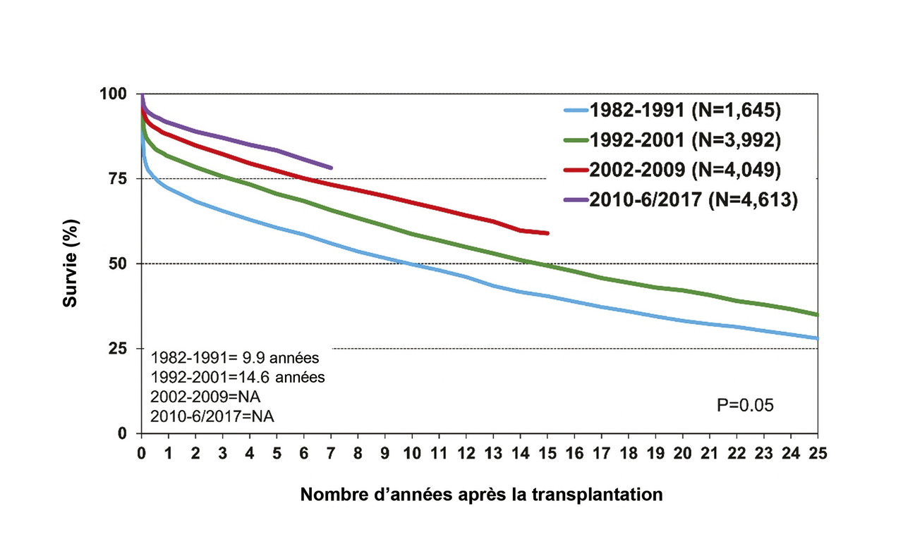 Chaque année, 4 000 à 4 500 transplantations cardiaques sont pratiquées, dont 10 % chez des enfants. Près de la moitié des receveurs pédiatriques sont des nourrissons de moins de 1 an. Les indications varient avec l’âge ; les malformations congénitales constituent l’indication principale chez les nourrissons (57 %) et les myocardiopathies chez les enfants plus âgés. Le taux de survie est globalement meilleur que chez les adultes. La médiane de survie est de dix-huit ans (variant de 24,5 ans pour les nourrissons à 14,3 ans pour les enfants de 11 à 17 ans). La mortalité est maximale durant la première année qui suit la transplantation. Par exemple, 60 % des nourrissons transplantés qui survivent au-delà de la première année sont vivants vingt-cinq ans plus tard. La mortalité initiale a progressivement diminué avec le temps.
