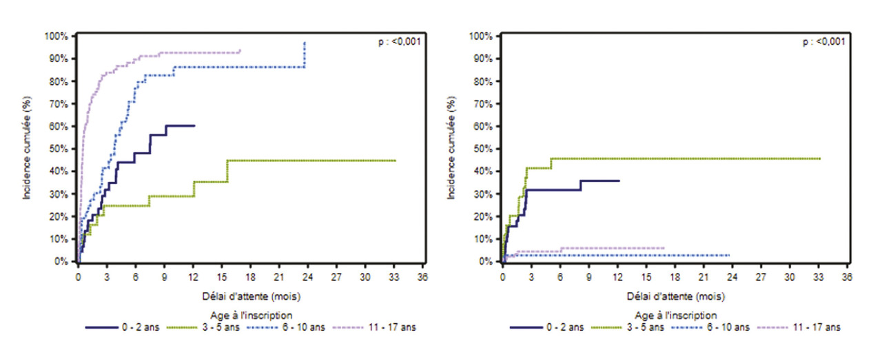 Selon les données françaises de l’Agence de la biomédecine, parmi 201 enfants inscrits sur la liste d’attente entre 2014 et 2019, les enfants de plus de 5 ans ont presque tous été transplantés, et ont pour la majorité survécu, tandis que les enfants plus jeunes (moins de 5 ans) ont subi une mortalité élevée avant de pouvoir être transplantés (
