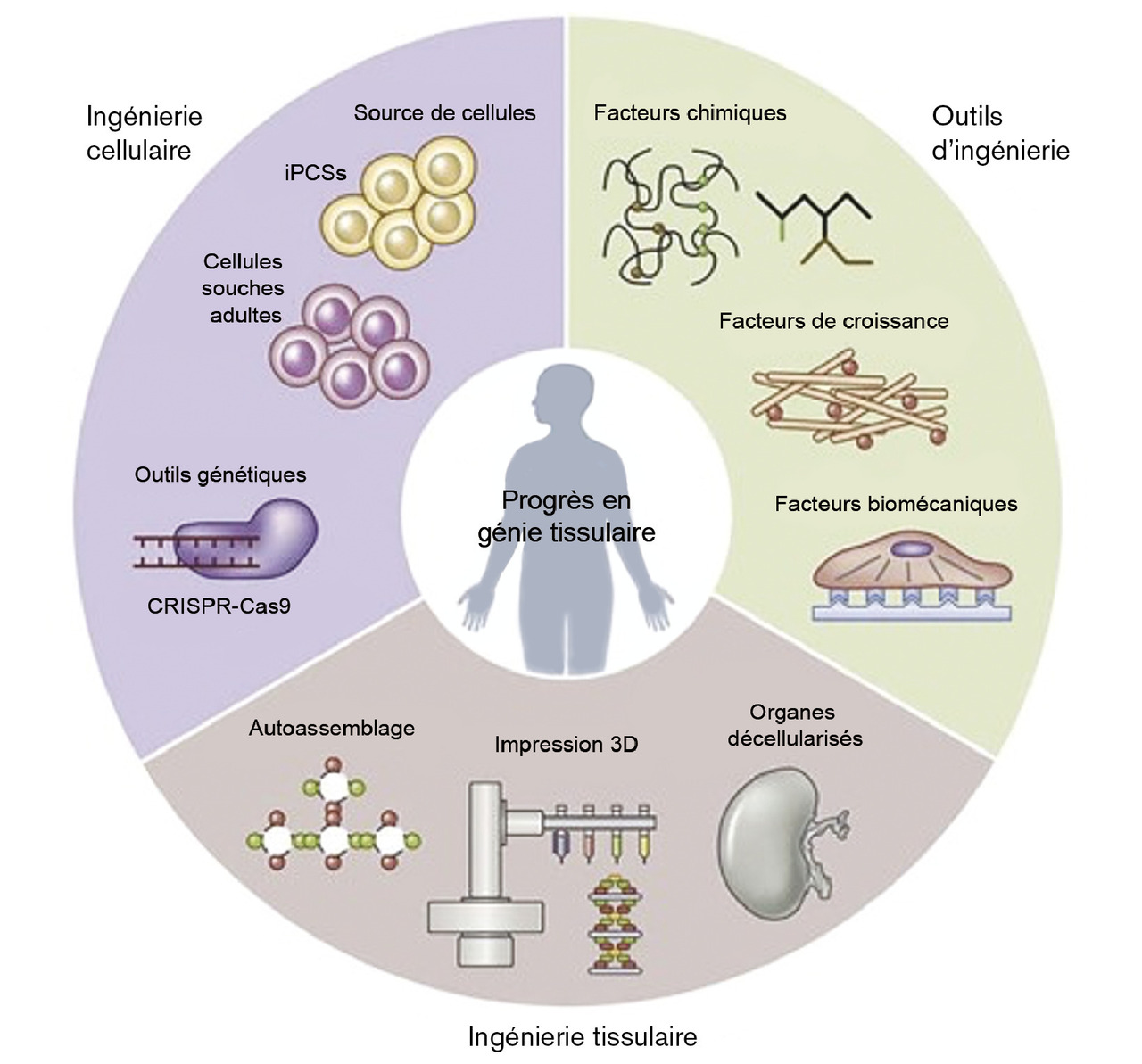 De constants progrès sont obtenus dans les différentes phases de ce processus. D’ores et déjà, dans le domaine cardiovasculaire, du péricarde, des vaisseaux sanguins, des valves cardiaques, des patchs myocardiques et, récemment, des cavités ventriculaires fonctionnelles, ont été créés. La création d’un cœur complet, avec ses différentes lignées cellulaires, reste un idéal, mais ne semble pas totalement hors d’atteinte.8 Cette avancée extraordinaire permettrait de résoudre à la fois le problème de la pénurie d’organes et celui des inconvénients du traitement immunosuppresseur.