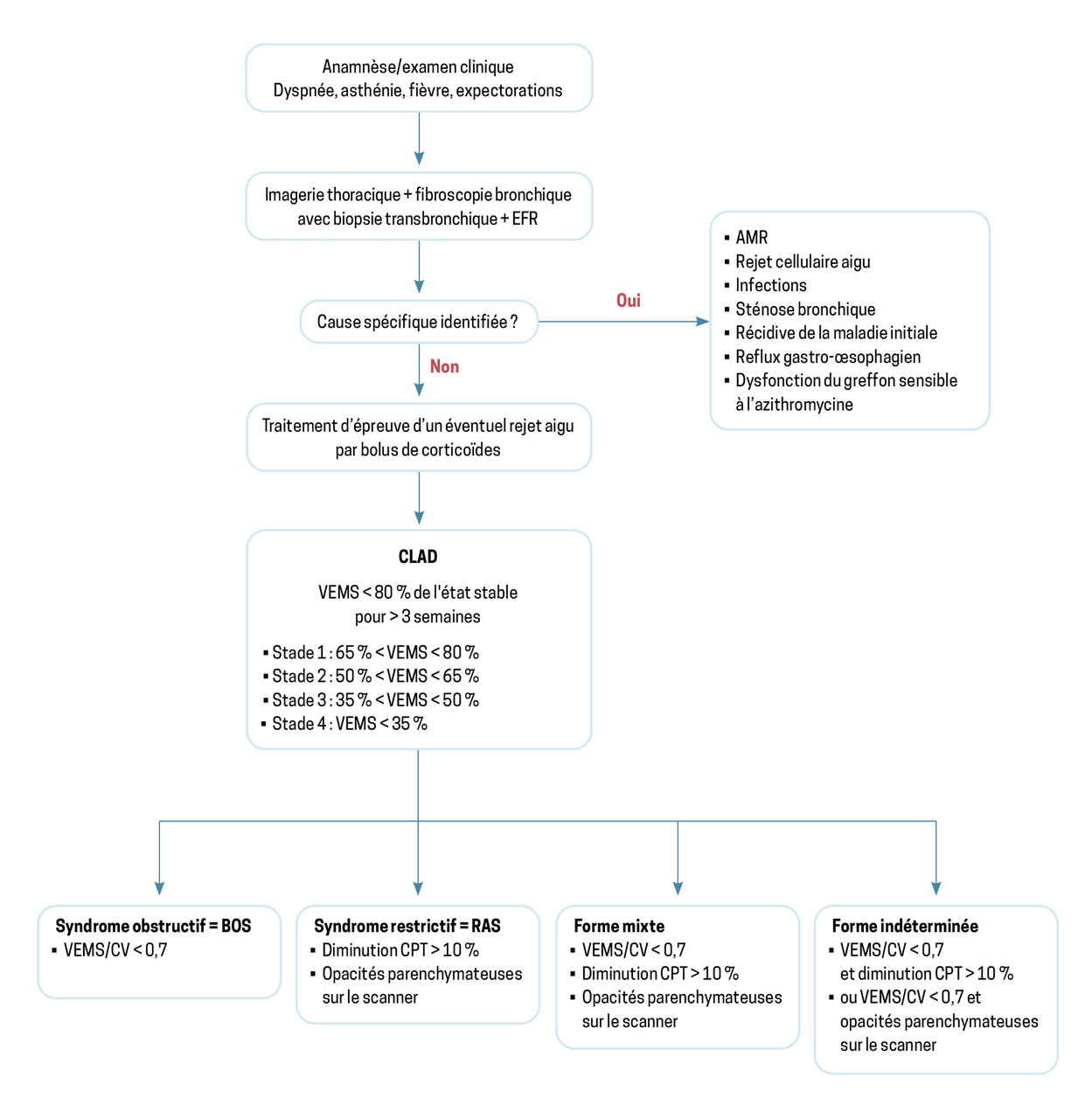 Dans la plupart des centres, des explorations sont faites dès la diminution de plus de 10 % du VEMS afin d’éliminer les diagnostics différentiels, qui comprennent le rejet aigu cellulaire, le rejet aigu médié par les anticorps, les infections, les sténoses bronchiques ou l’insuffisance cardiaque. La figure 3 propose un algorithme décisionnel devant un patient greffé pulmonaire symptomatique.