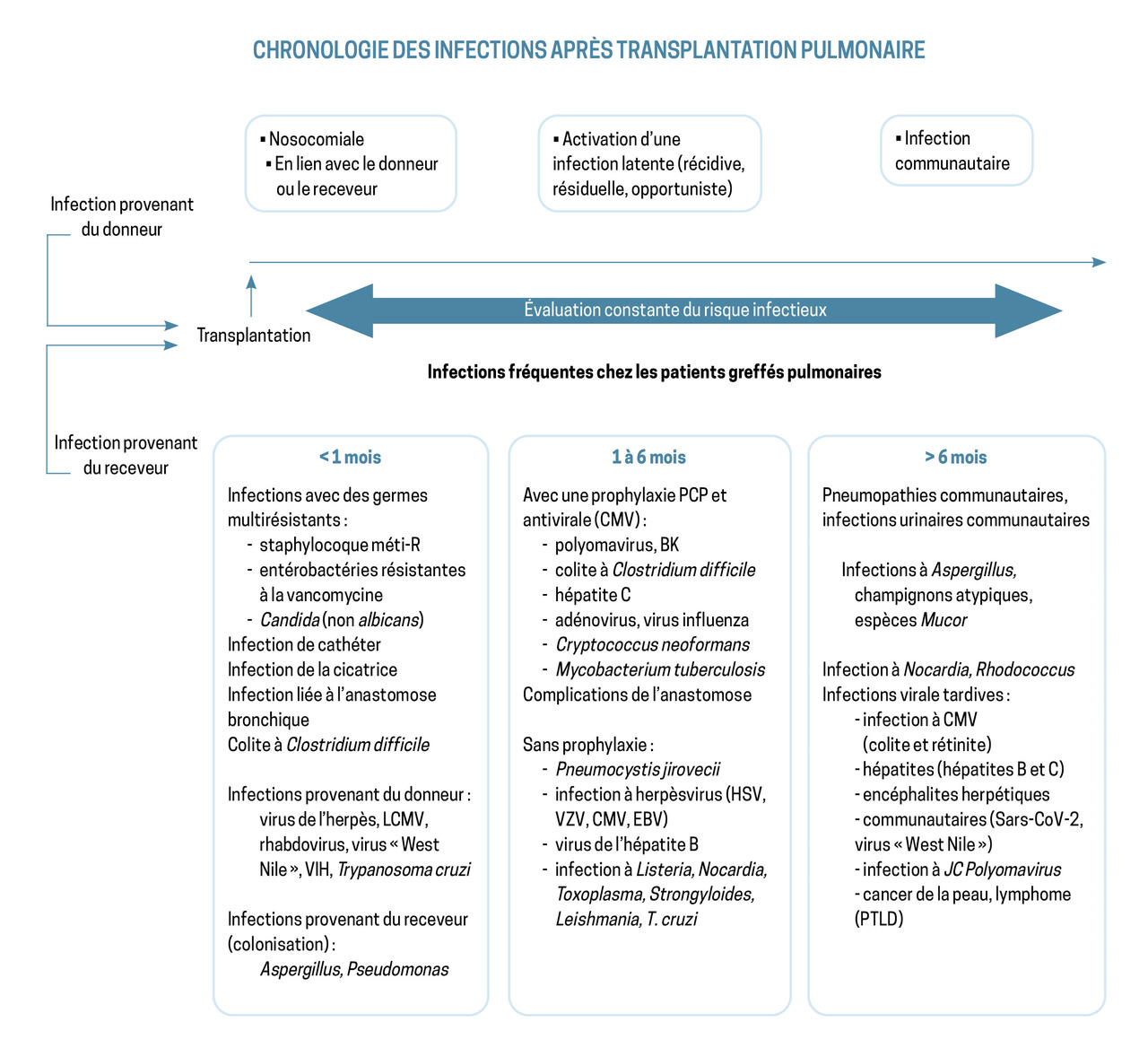 Toute fièvre chez un patient greffé doit être rapidement prise en charge : recherche d’une porte d’entrée potentielle, de signes de gravité ou de mauvaise tolérance. La figure 2 résume les germes auxquels le patient est exposé en fonction de la période post-opératoire.