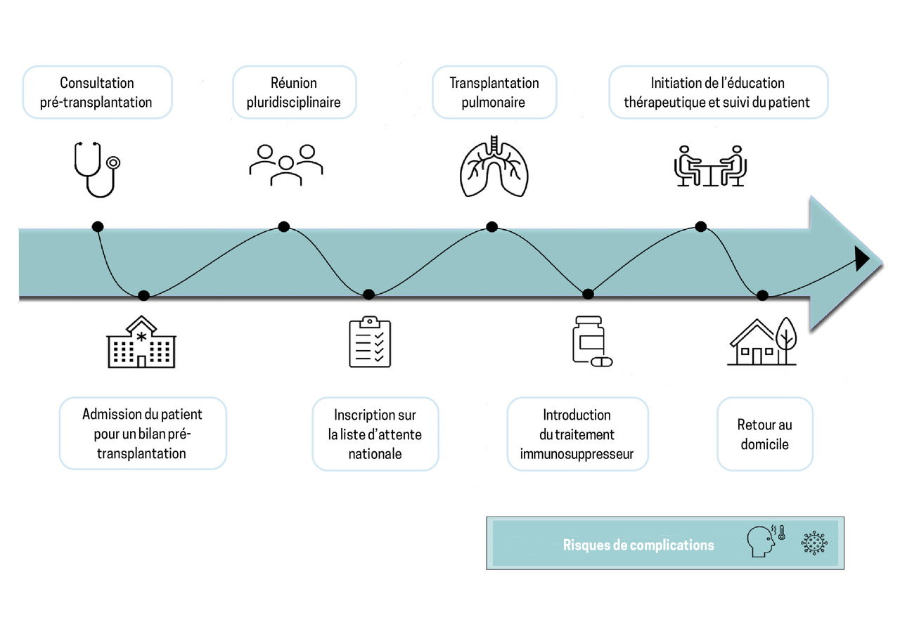Les contre-indications absolues à la transplantation pulmonaire sont rappelées dans l’encadré.3 Le projet de transplantation pulmonaire (fig. 1) est un parcours complexe, nécessitant que les patients soient adressés à un centre de transplantation le plus tôt possible dès lors qu’ils répondent aux critères.