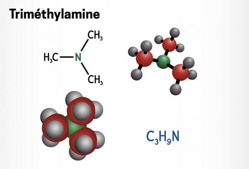 La triméthylamine est une molécule volatile de la famille des amines tertiaires. Sa formule chimique est N(CH3)3. Ce composé, présent dans le sang et la chair des poissons, est un métabolite de la choline et est responsable de l’odeur du poisson.1 Dans le corps humain, la triméthylamine malodorante (TMA) d’origine alimentaire est métabolisée en oxyde de triméthylamine sans odeur (TMAO) grâce à une enzyme hépatique : la flavine mono-oxygénase 3 (FMO3).2 En cas de déficit enzymatique (partiel ou complet), la TMA ne peut plus être métabolisée correctement. Elle est alors éliminée dans la sueur, l’urine3 et à l’expiration4, provoquant une forte odeur de poisson.