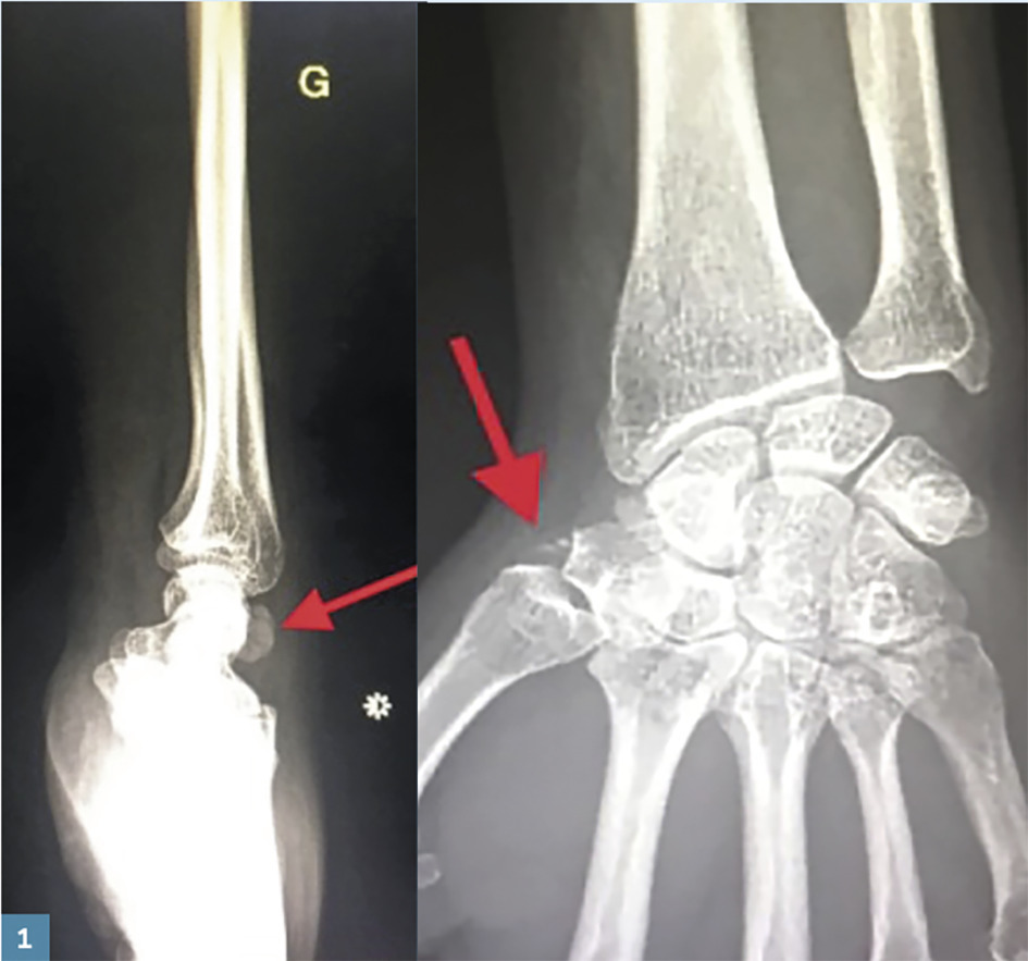 À la radiographie du poignet : calcifications en regard du bord radial du trapèze et de la face dorsale du carpe, en faveur d’une arthropathie microcristalline.