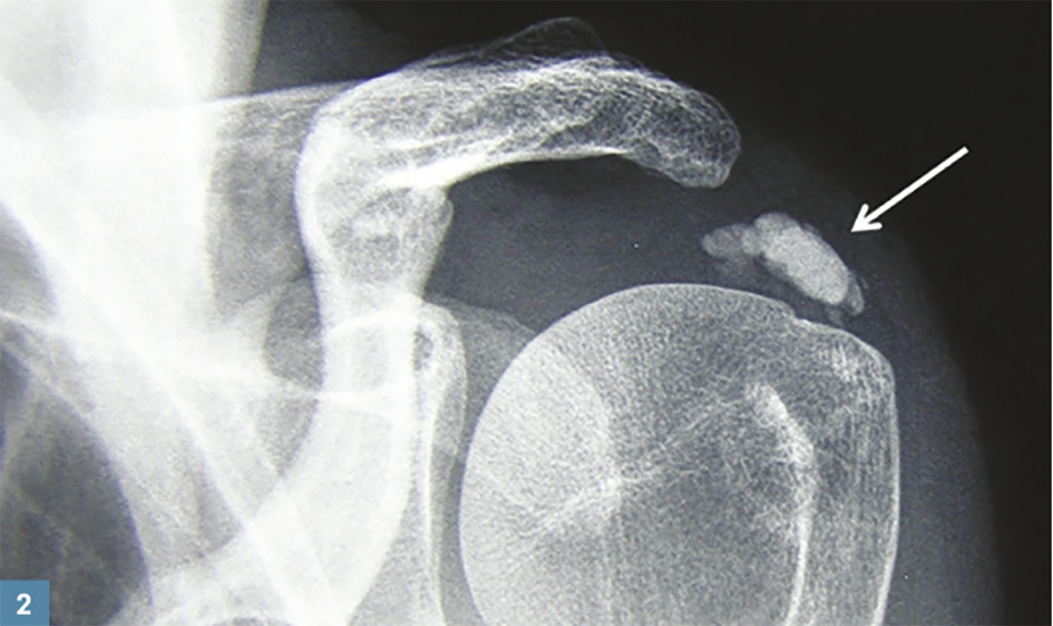 Le rhumatisme apatitique est la conséquence de dépôts de cristaux de phosphate de calcium basique, qui sont normalement présents dans l’os et la dentine. Ils sont essentiellement localisés en péri-articulaire, parfois au rachis, plus rarement dans les articulations, surtout au niveau de l’épaule (60 % des cas ; fig. 2 ), du coude et du poignet. En cas de dépôts sur plusieurs sites, on parle de « maladie des calcifications tendineuses multiples », à l’origine de douleurs chroniques polyarticulaires.