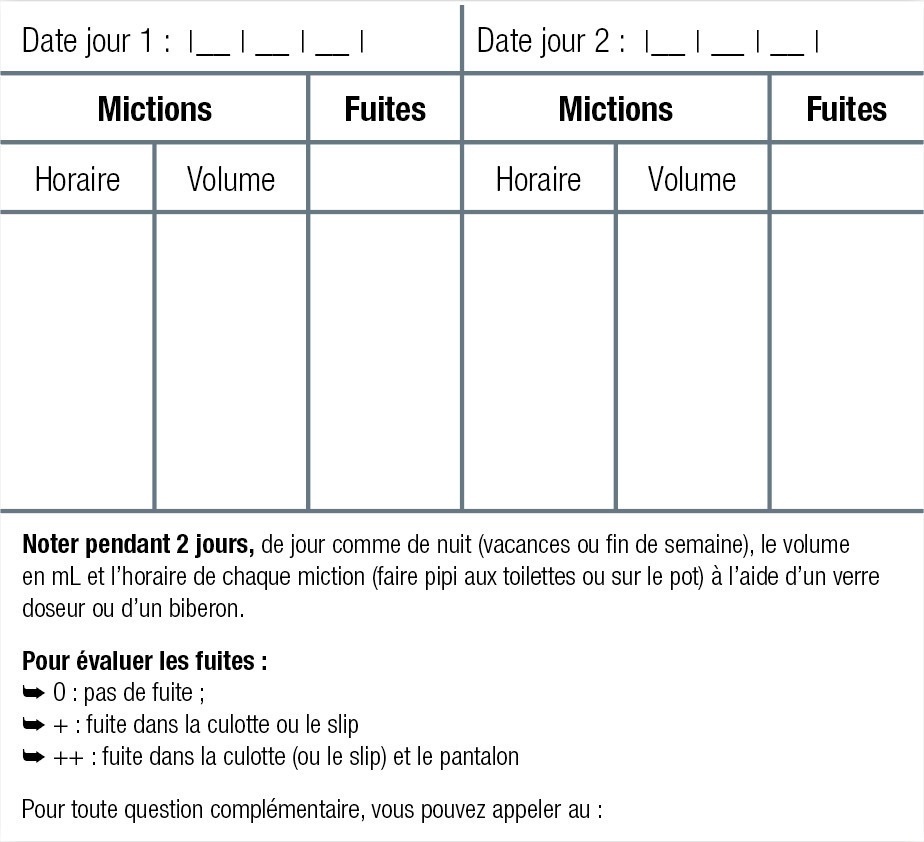 Le calendrier mictionnel permet une évaluation objective des symptômes. La diurèse des 24 heures permet d’éliminer une polyurie.