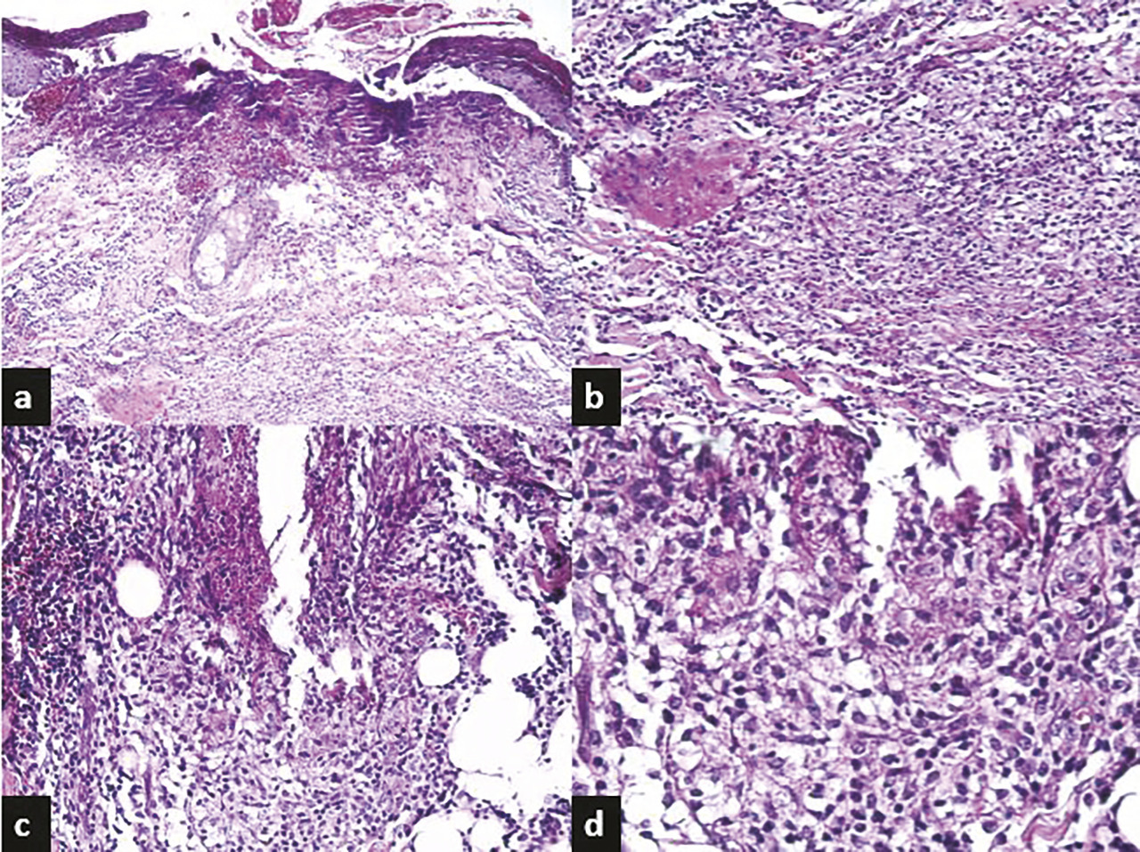 il montre une pyodermite ulcérée avec ébauche de palissade épithélioïde autour d’une nécrose suppurée (
