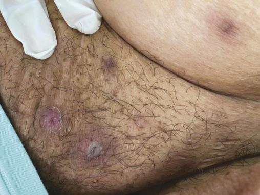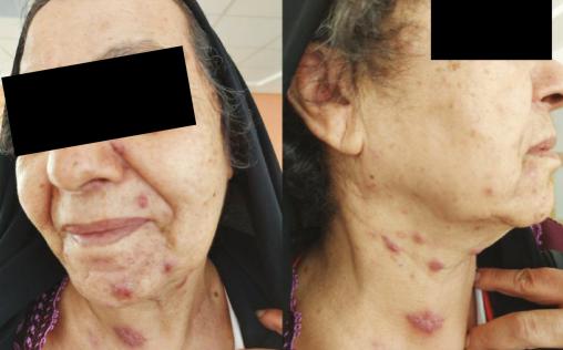 Une patiente de 76 ans, diabétique, a été opérée pour une néoplasie du sein gauche en 2016 et a bénéficié ensuite d’une radiochimiothérapie. Elle est suivie depuis 2018 pour un lymphome B à grandes cellules classé stade IV ; elle a reçu six cures de chimiothérapie avec une bonne évolution. Elle présente des lésions du visage évoluant depuis neuf mois traitées par antibiothérapie sans amélioration. À l’examen physique, la patiente a un état général conservé, est apyrétique, avec de multiples lésions gommeuses, certaines nodulaires sous-cutanées violacées et d’autres fistulisées avec issue de pus, au niveau du visage, du cou, du tronc et du pubis (fig. 1 et 2 ). L’examen histologique de la biopsie cutanée est en faveur d’une tuberculose principalement en phase vasculo-exsudative ;
