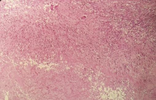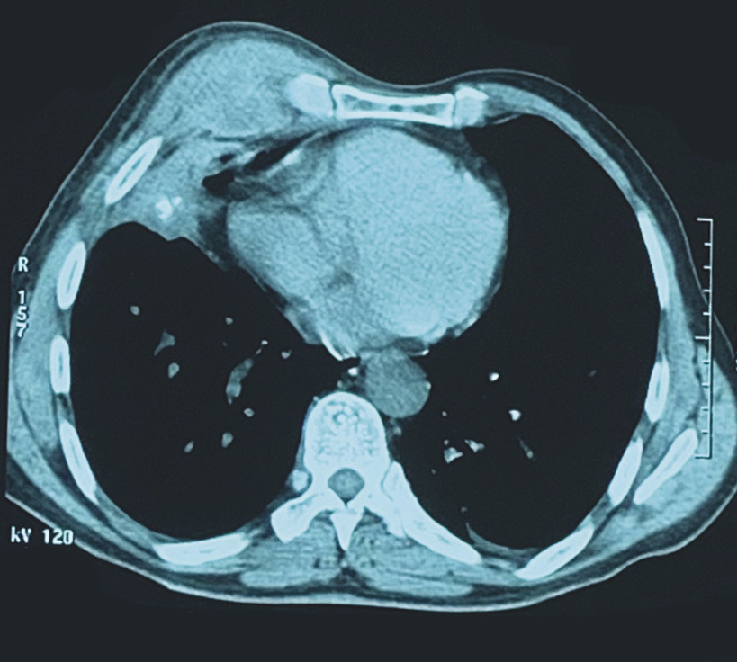 Ce patient de 48 ans, tabagique chronique (25 paquets-années), avait depuis 1 mois une tuméfaction parasternale droite fluctuante en son centre, avec une peau inflammatoire en regard. L’échographie des parties molles montrait une collection hétérogène et hypoéchogène au niveau de la paroi thoracique antérieure droite. La tomodensitométrie thoracique montrait un processus lésionnel pariétal parasternal droit mesurant 68 x 35 x 28 mm en continuité avec un foyer pulmonaire droit (fig. 1 ). Le bilan biologique montrait un syndrome inflammatoire, avec une protéine C-réactive à 56 mg/L, des lymphocytes à 12 500 éléments/mm3 ; la recherche de bacilles de Koch dans les expectorations et dans le liquide de ponction de la collection pariétale était négative à l’examen direct. La biopsie mettait en évidence des granulomes épitélioïdo-giganto-cellulaires avec nécrose caséeuse (fig. 2 ). La sérologie du VIH était négative, et le patient mis sous traitement antituberculeux pendant 6 mois, avec une bonne évolution clinique et radiologique.