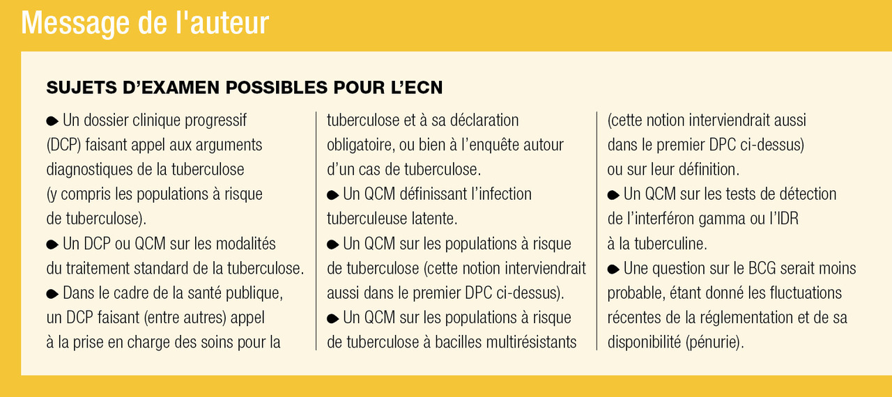 Le diagnostic de la tuberculose est évoqué sur le contexte, les symptômes, l’imagerie ou l’anatomopathologie. Il est affirmé par l’analyse bactériologique (prélèvements de quantité et de qualité suffisantes) qui permet de plus un antibiogramme systématique. Le traitement est standardisé, l’observance est essentielle pour prévenir les résistances. C’est une maladie à déclaration obligatoire et bénéficiant du statut d’affection de longue durée ou professionnelle selon l’activité du patient.