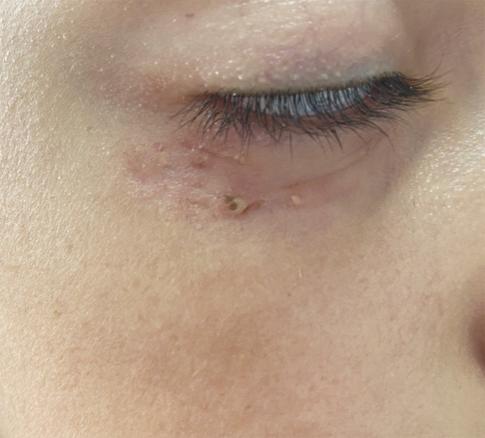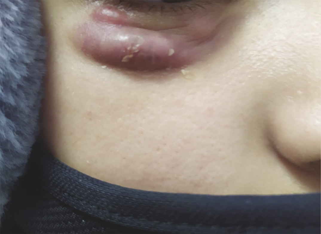 Cette fillette de 11 ans, immunocompétente et sans antécédents particuliers, consultait pour un nodule de la paupière inférieure droite évoluant depuis 3 mois. Elle était en bon état général, vaccinée par le BCG et ne rapportait aucun signe respiratoire ou d’imprégnation tuberculeuse. Il existait une lésion cutanée nodulaire, érythémateuse, indolore, surmontée de croûtes jaunâtres et hémorragiques de la paupière inférieure droite, dont le grand axe mesurait 3 cm (