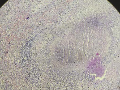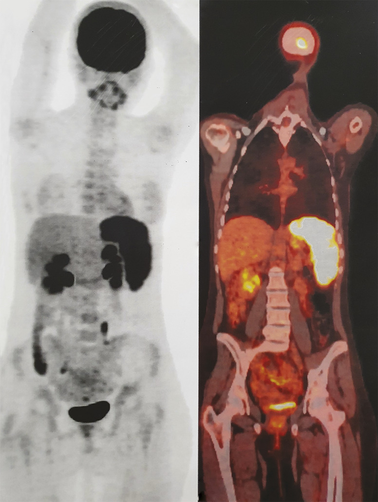 Cette jeune fille de 17 ans, sans antécédents particuliers, décrivait depuis trois mois une fièvre, des sueurs nocturnes, des céphalées, une asthénie, et un amaigrissement de 10 kg en deux mois. À l’examen, on notait une fièvre à 38 °C et une tachycardie à 110 batt/min. La biologie montrait un syndrome inflammatoire, avec une protéine C-réactive à 114 mg/L. Les bilans infectieux et immunologique étaient normaux. Une tomographie par émission de positons (TEP) au 18F-FDG objectivait une splénomégalie intensément hypermétabolique, pathologique, de fixation hétérogène (fig. 1 ). L’étude histologique (fig. 2 ) de la pièce de splénectomie (fig. 3 ) avait posé le diagnostic de tuberculose splénique. Sous traitement antituberculeux, une amélioration clinique et biologique avait été obtenue.