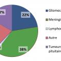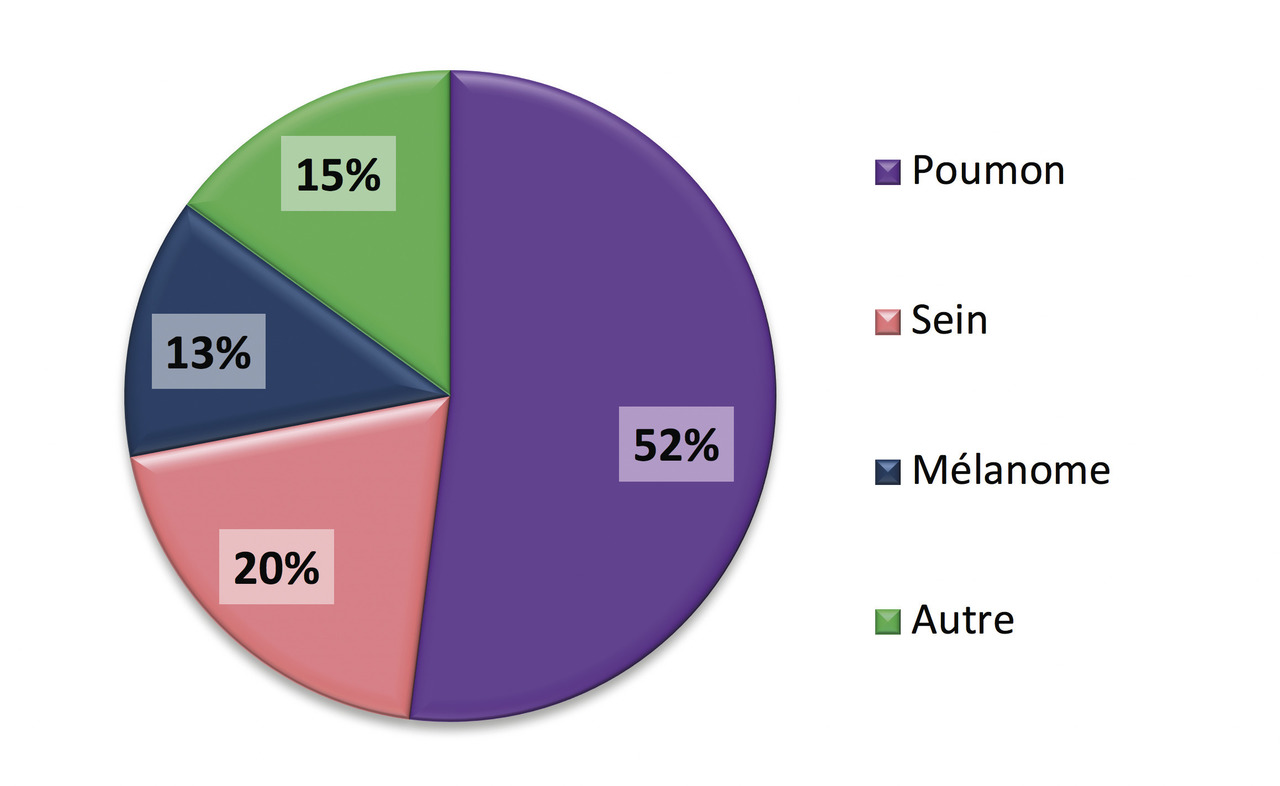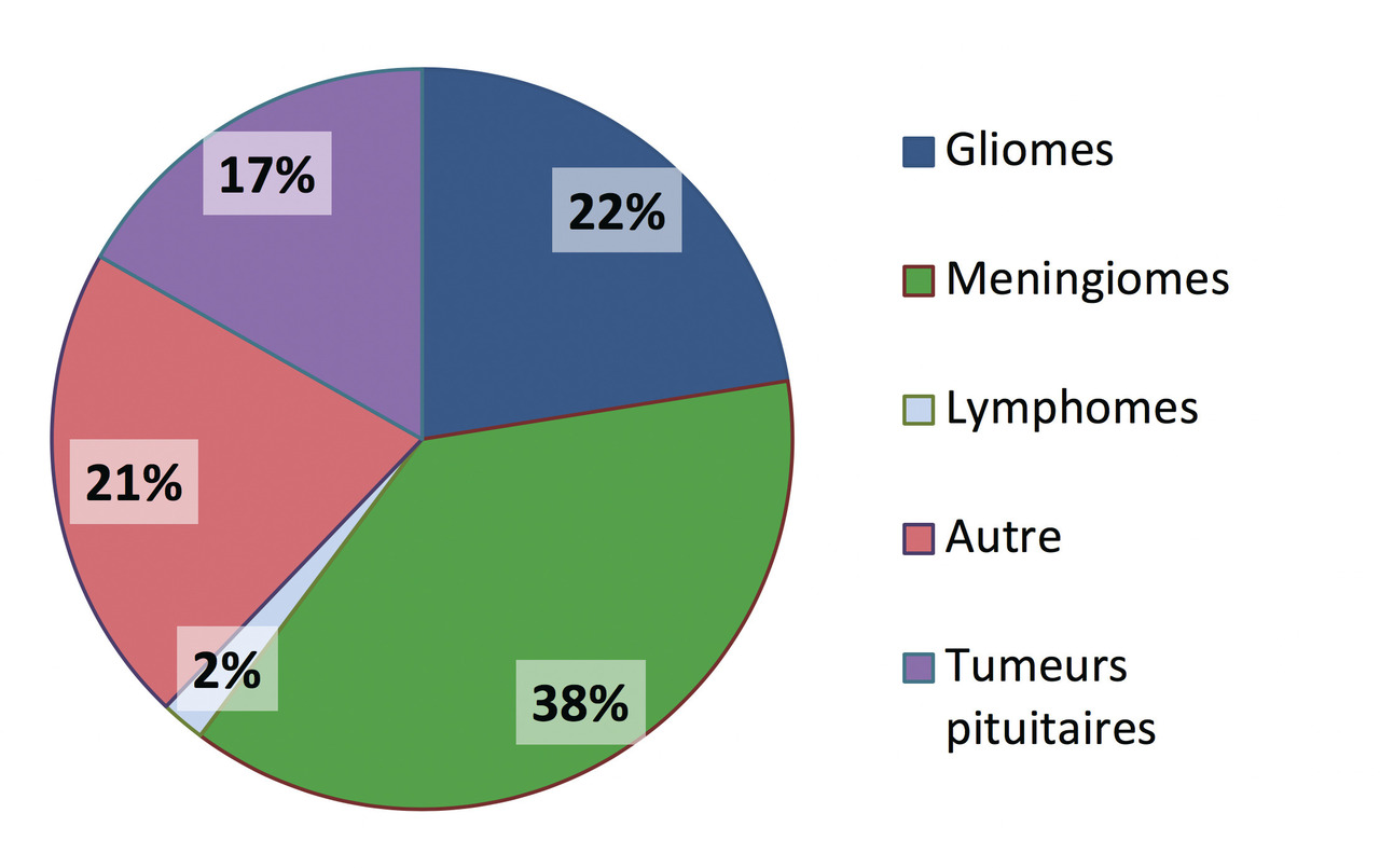 Les tumeurs cérébrales primitives les plus fréquentes sont représentées par les méningiomes, les tumeurs hypophysaires (qui ne seront pas développés dans cet article) et les tumeurs gliales ou gliomes. Les tumeurs gliales sont classées en grade de malignité croissante allant de 1 à 4. Les glioblastomes qui correspondent au grade 4 constituent la majorité des gliomes. Les métastases cérébrales compliquent l’évolution des cancers dans plus de 10 % des cas (20 % dans les séries autopsiques). Les cancers bronchopulmonaires et mammaires sont à eux seuls à l’origine de près de deux tiers des métastases cérébrales (