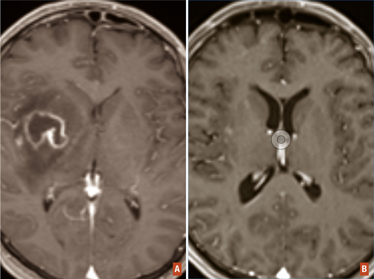 La suspicion d’une tumeur cérébrale doit conduire à une imagerie cérébrale. Le scanner cérébral sans et avec injection de produit de contraste est habituellement réservé en cas de contre-indication à l’imagerie par résonance magnétique (IRM) ou dans certaines situations d’urgence où une IRM ne peut être obtenue rapidement. L’IRM cérébrale représente actuellement l’examen de référence. Elle a plusieurs rôles : localiser le processus, préciser ses caractéristiques, diagnostiquer de possibles complications (engagement, hémorragie, hydrocéphalie…), contribuer à définir la suite de la stratégie diagnostique et thérapeutique. Elle doit être réalisée optimalement dans les trois plans de l’espace et comporter une séquence T1 sans et avec gadolinium, une séquence T2 et/ou FLAIR. L’IRM multimodale (Étude du LCR