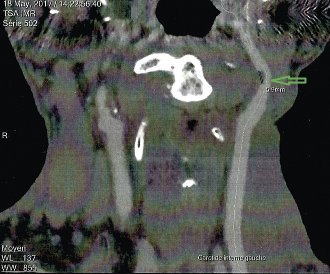 L’échodoppler des vaisseaux du cou objective une sténose de 52 % au niveau du bulbe carotidien. L’angioscanner (