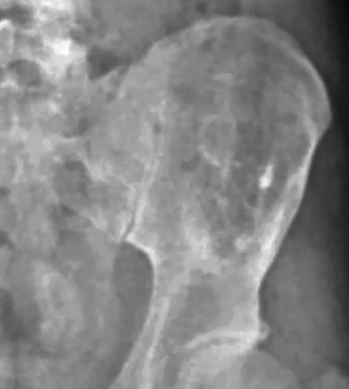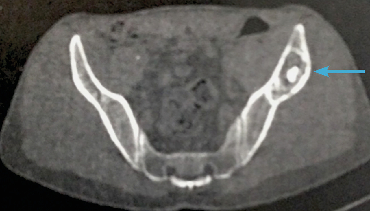 Arnaud, 37 ans, militaire sportif et asymptomatique, consulte avec les radiographies prescrites pour une expertise médicale initiale au parachutisme. L’aile iliaque gauche est le siège d’une lacune osseuse assez importante de découverte fortuite (fig. 1 ).