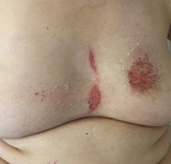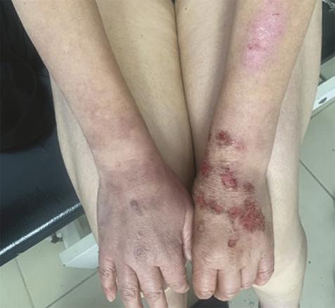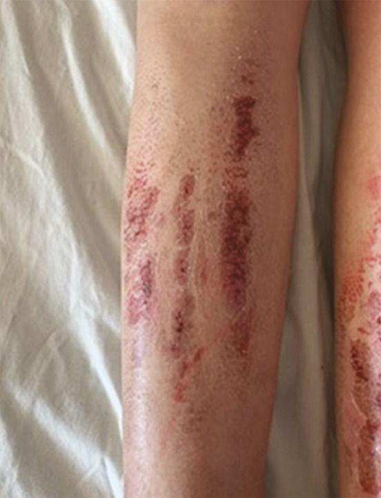 Cette patiente de 54 ans, célibataire, de bas niveau socioéconomique, décrivait des lésions érosives et croûteuses récurrentes évoluant depuis dix ans. La biopsie cutanée d’une bulle avait montré un décollement intra-épidermique et la recherche d’anticorps, anti-DSG1 et 3, anti-BP180 et BP230, anti-envoplakine-périplakine et collagène VII, était négative. Sous corticothérapie orale et azathioprine, prescrites pendant trois ans par le médecin traitant, les récidives étaient fréquentes. Il existait des placards érosifs à contours nets, arrondis et linéaires, couverts de croûtes hémorragiques des membres (