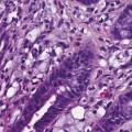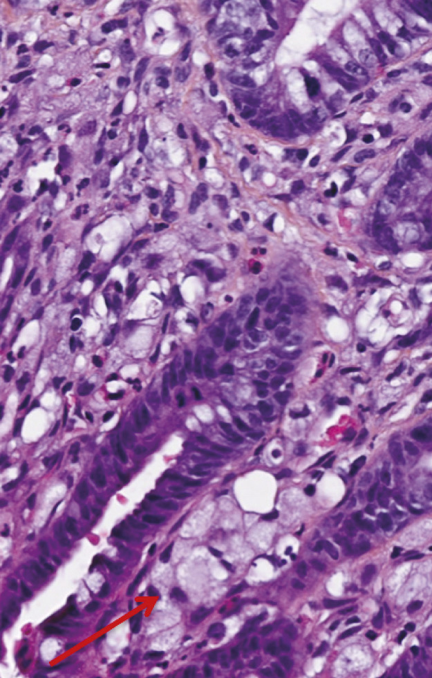 L’examen anatomopathologique de la pièce opératoire montre l’existence d’un adénocarcinome peu différencié de l’antre gastrique, de 42 x 23 mm, avec un contingent majoritaire de cellules isolées en bague à chaton (60 %) dans un stroma fibreux. La lésion est classée pT3N1Mx. La réponse à la chimiothérapie préopératoire est moyenne, estimée selon la classification de Mandard à TRG3. Les marges de résection sont saines d’envahissement tumoral (R0).