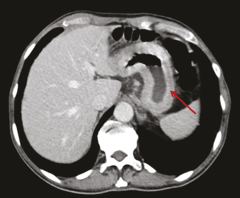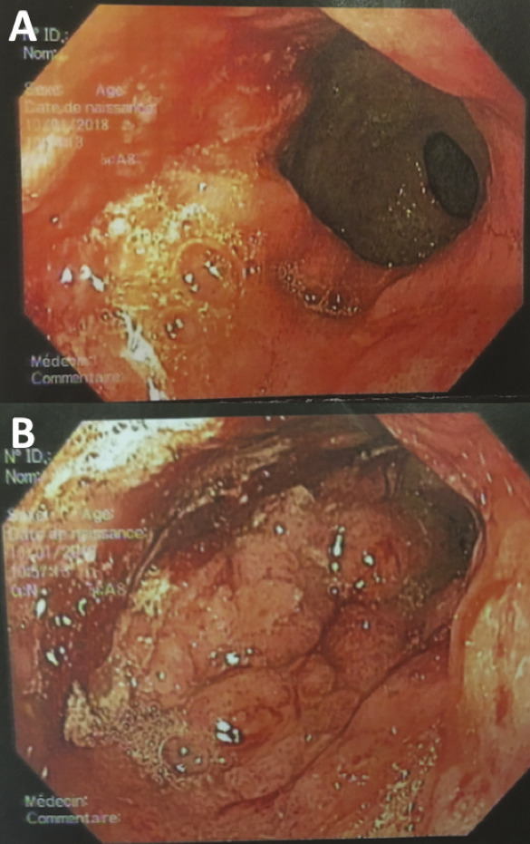 Un mois et demi plus tard, devant la persistance des symptômes et la perte de 6 kg supplémentaires, une tomodensitométrie est réalisée, qui montre un aspect épaissi de la paroi gastrique mesurant 17 mm d’épaisseur, limité à l’antre gastrique. Une nouvelle endoscopie œsogastroduodénale est alors réalisée, qui ne note pas d’anomalie évidente, si ce n’est toujours un aspect rigide à l’insufflation. Une écho-endoscopie haute est réalisée, qui révèle un épaississement localisé de la paroi gastrique et permet des biopsies guidées qui décè- lent la présence d’un adénocarcinome gastrique avec présence de cellules indépendantes.