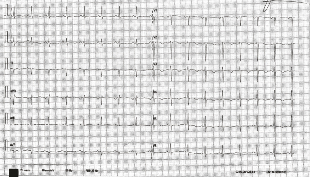 La patiente était adressée en cardiologie. Dans le contexte de son antécédent de cancer, d’une dyspnée aiguë et d’une élévation des D-dimères (3 120 ng/L), une angio-tomodensitométrie thoracique avait été prescrite, qui n’avait pas montré d’embolie pulmonaire mais des opacités bilatérales pseudo-nodulaires compatibles avec une surcharge vasculaire. À son arrivée, la patiente était cliniquement stable. Sa pression artérielle était mesurée à 116/94 mmHg, sa fréquence cardiaque à 100 batt/min, une saturation à 99 % sous 2 L d’O2, sa température était mesurée à 37,1 °C. L’électrocardiogramme (ECG) [fig. 2 ] montrait des ondes T négatives dans le précordium.