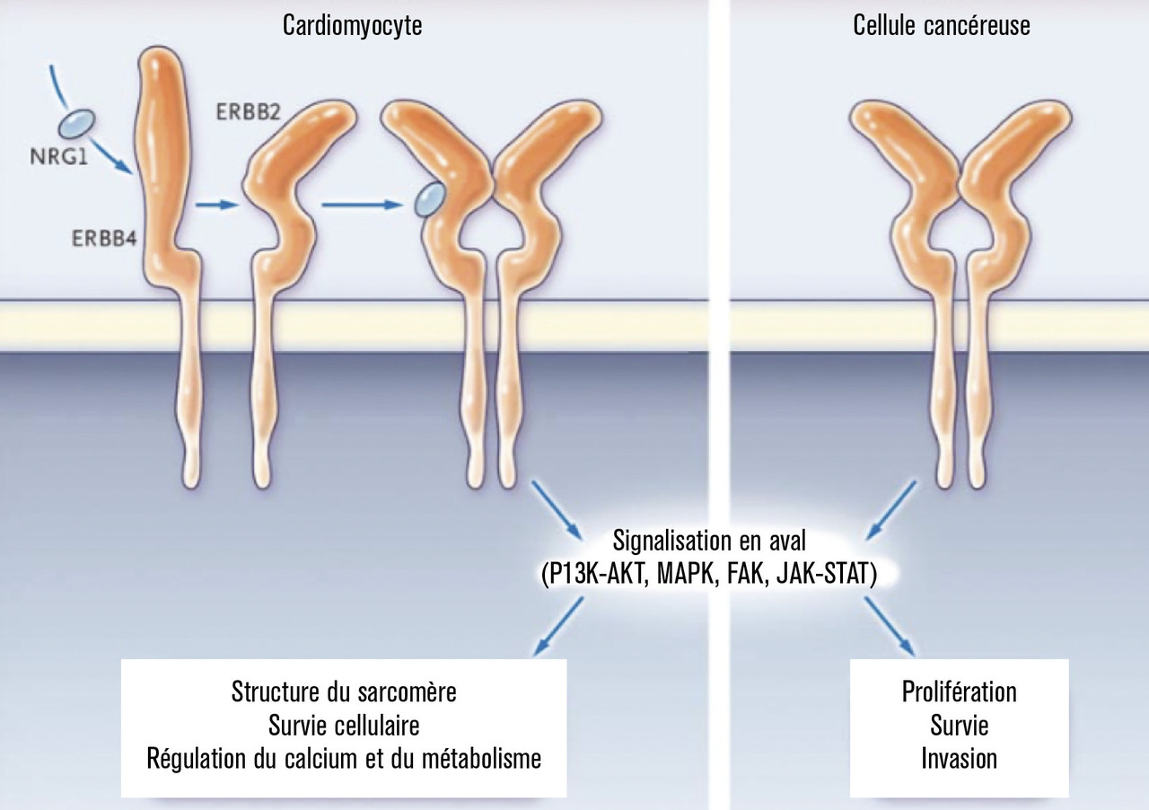 Le trastuzumab est une thérapie ciblée. Cet anticorps monoclonal humanisé anti-HER2 est utilisé dans les cancers du sein surexprimant HER2 ; il a permis d’améliorer le pronostic en association aux chimiothérapies.1 L’inhibition de l’activité ligand/récepteur HER2 bloque la phosphorylation de kinases intracellulaires qui sont des régulateurs de la survie du cardiomyocyte (fig. 1 ).2