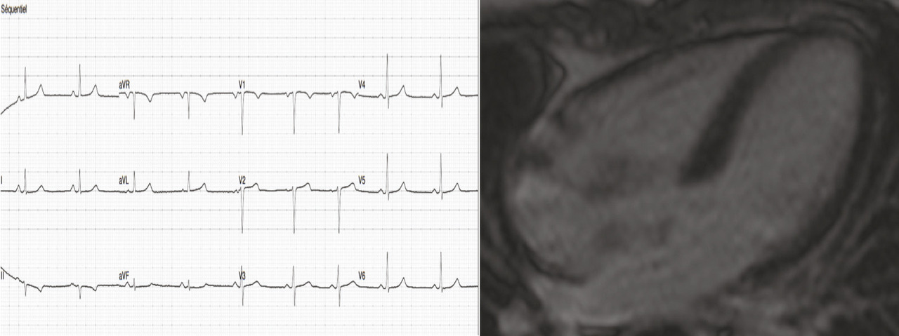 La patiente était revue en consultation de cardiologie en septembre 2017 : sa pression artérielle était de 125/84 mmHg, sa fréquence cardiaque était mesurée à 86 batt/min, le BNP était à 35 ng/L, l’ECG était normal. L’échographie cardiaque montrait une FEVG à 52 % et un ventricule gauche non dilaté. L’IRM cardiaque montrait un ventricule gauche non dilaté, une FEVG à 56 %, sans réhaussement tardif ni séquelle d’infarctus. On maintenait le traitement par ramipril 10 mg et bisoprolol 7,5 mg. La spironolactone et le furosémide étaient arrêtés.