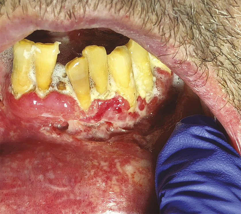 Cet homme de 56 ans vivant avec le VIH et en rupture thérapeutique, était adressé pour une gingivite ulcéro-nécrotique (