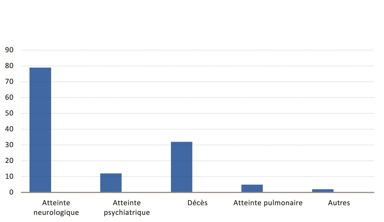 La littérature abonde en articles rapportant des troubles aigus et chroniques neurologiques et psychiatriques. Ces troubles sont liés à un déficit en vitamine B12 induit par le protoxyde d’azote.7-13 Les troubles pulmonaires, plus rares, sont liés à la toxicité du gaz. Certains patients ayant plusieurs atteintes en même temps (v. figure ).