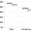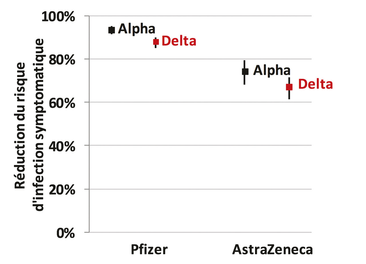 En Angleterre, une enquête cas-témoins a comparé la proportion de non-vaccinés chez des personnes symptomatiques infectées par les variants Alpha ou Delta et chez des témoins, testés pour symptômes mais négatifs. Elle montre que l’efficacité de deux doses du vaccin Pfizer-BioNTech, mesurée avec le critère des infections symptomatiques, est un peu moins bonne contre le variant Delta que contre le variant Alpha (88 % au lieu de 94 %). Il en est de même pour le vaccin AstraZeneca (