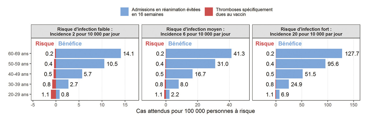 Le Winton Centre for Risk and Evidence Communication de l’université de Cambridge a évalué la balance bénéfice-risque en fonction de l’âge des personnes vaccinées et du risque d’infection12 (fig. 1 ). Cette balance est bien meilleure si le risque d’infection est élevé et si les personnes vaccinées sont âgées. Elle est mauvaise dans la population de 20 à 29 ans et varie, selon le risque d’infection, de 0,8 à 6,9 admissions en réanimation évitées par le vaccin pour 1,1 thrombose causée par le vaccin. Au contraire, la balance bénéfice-risque est bonne dans les autres classes d’âge, et d’autant meilleure que la population est plus âgée (NDLA : L’infection par le Sars-CoV-2 provoque aussi des thromboses).