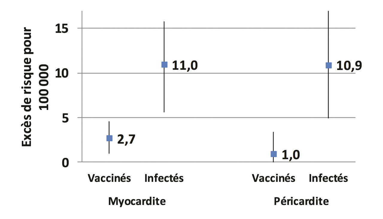 Des cas de myocardites et de péricardites ont été signalés après vaccination contre la Covid-19 avec les vaccins Pfizer ou Moderna. Une étude récente, menée en Israël sur une importante base de données de santé, compare ces risques chez des témoins, des patients infectés par le Sars-CoV-2, et des personnes vaccinées avec le vaccin Pfizer. Comparé à celui des témoins, le risque de myocardite est augmenté de 2,7 pour 100 000 vaccinés mais de 11 pour 100 000 personnes infectées par le Sars-CoV-2 (
