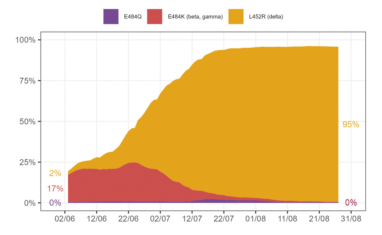 Les tests PCR de criblage permettent de suspecter la présence de certains variants. Depuis le 31 mai 2021, le système de criblage identifie la présence de trois mutations : L452R, plus ou moins spécifique du variant Delta, E484K, plus ou moins spécifique des variants Bêta ou Gamma, et E484Q. Cette méthode de criblage a été utilisée pour 53 à 58 % des tests PCR positifs réalisés entre le 12 juin et le 19 septembre 2021, et du 18 au 24 septembre, 95 % des tests criblés révélaient la mutation L452R, donc étaient probablement des variants Delta (fig. 3 ).28