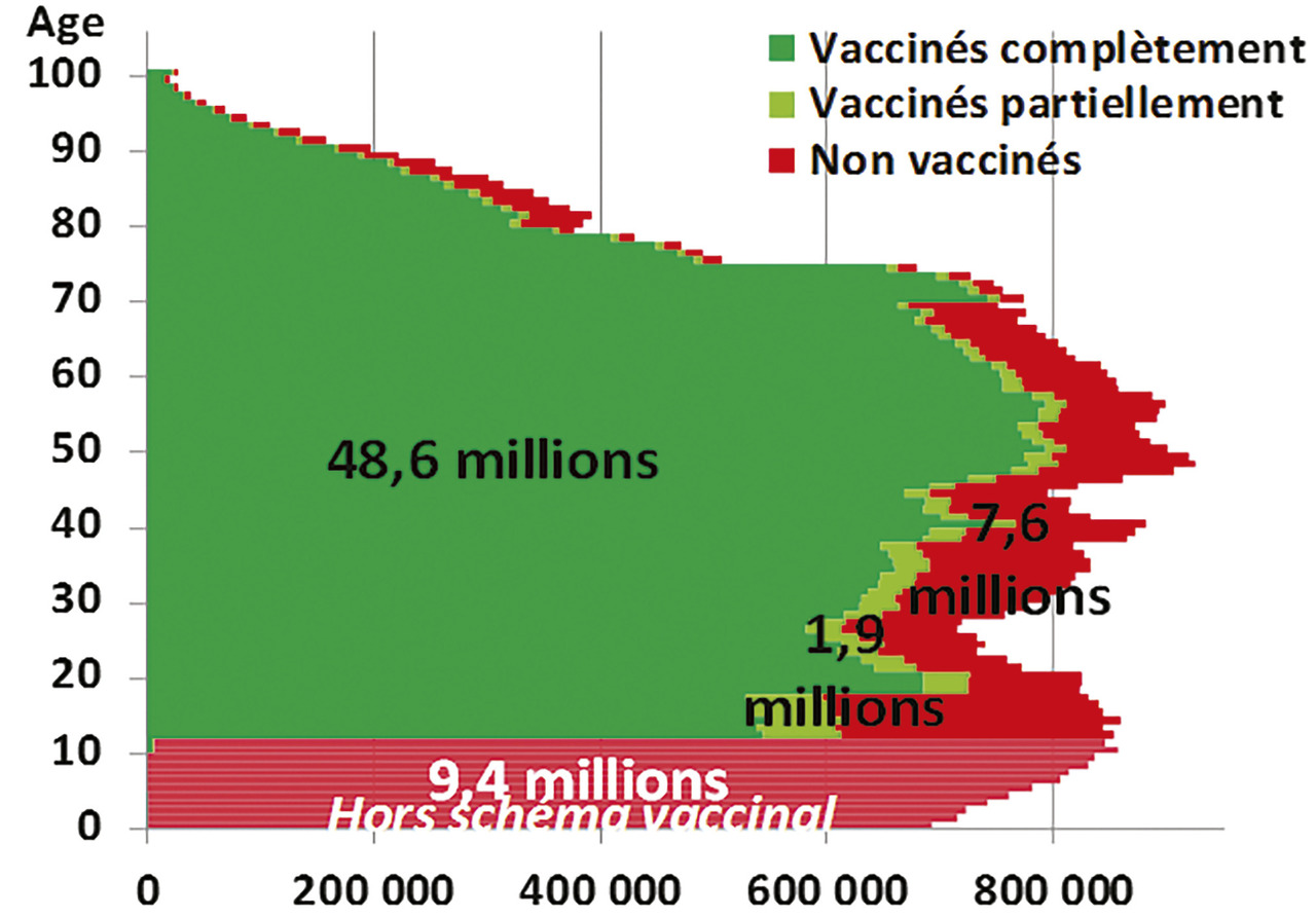 Au 26 septembre 2021, la population de 12 ans et plus, éligible à la vaccination, comptait 84 % de personnes complètement vaccinées, 3 % de personnes en cours de vaccination, et 13 % de non vaccinées (fig. 5 ). La couverture maximale était observée dans la population de 70 à 79 ans, avec 3 % de non-vaccinés, mais il restait 14 % de non-vaccinés dans la population âgée de 80 ans et plus ; d’où l’urgence à organiser la vaccination à domicile de ces personnes trop âgées et peu mobiles. Pfizer a annoncé que son vaccin, qui devait initialement être conservé entre -80 °C et -60 °C, pouvait être stocké pendant deux semaines entre -25 °C et -15 °C, 42 ce qui devrait faciliter son utilisation.