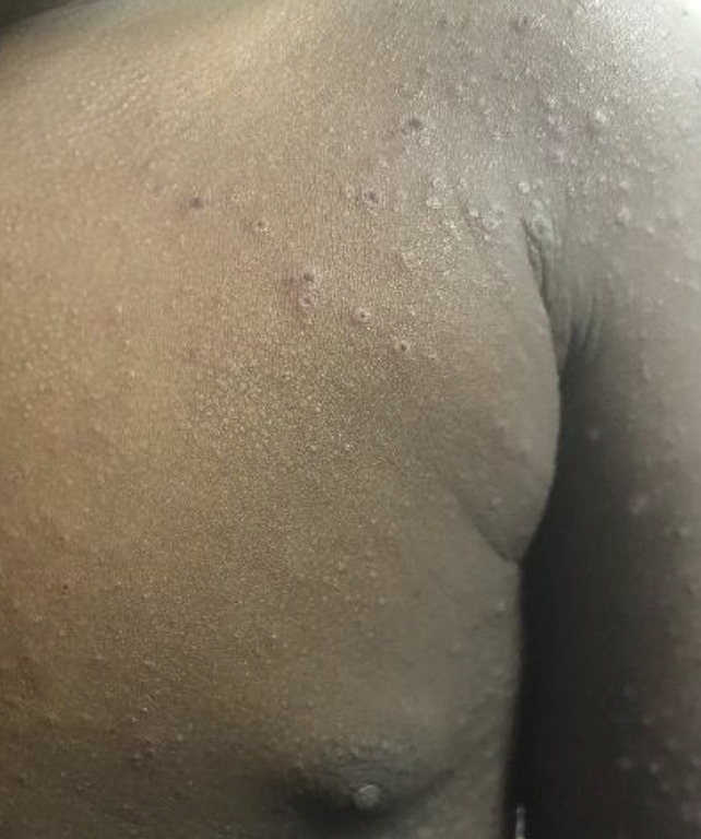 François, 18 ans, et Richard, 40 ans, sans antécédents notables, consultent pour une éruption prurigineuse constituée de papules, vésicules ombiliquées et croûtes d’âge différent et évoluant depuisquarante-huit heures (figures).