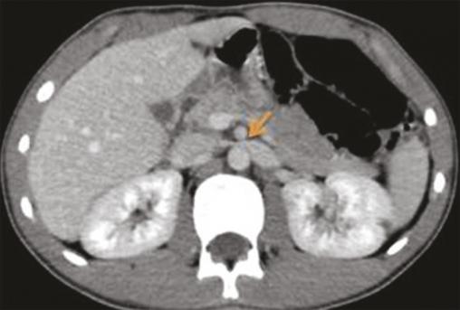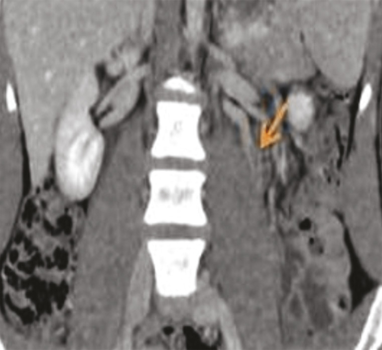 La tomodensitométrie (TDM) a montré une dilatation de la veine rénale de 9 mm, en amont de la pince aortomésentérique (