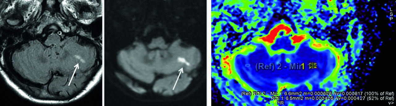 Série axiale en diffusionpour dépister un AVC ou une cause périphérique (kyste épidermoïde).