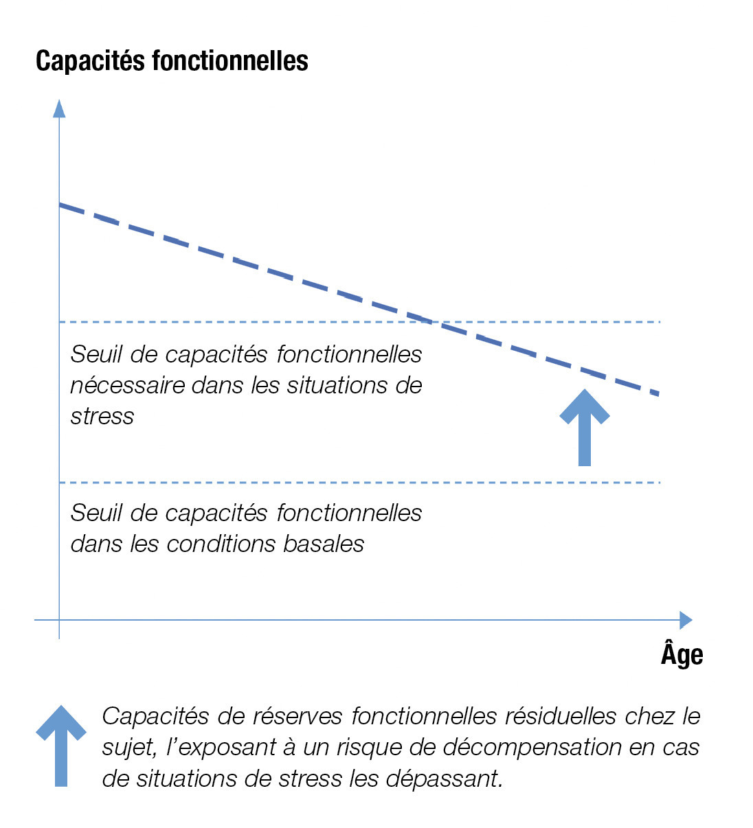 Le vieillissement entraîne une diminution des capacités fonctionnelles dont l’intensité est variable d’un organe à l’autre, d’un individu à l’autre, à âge égal. Cette réduction des capacités fonctionnelles de réserve entraîne une réduction des capacités d’adaptation ou de réaction face au stress.
