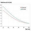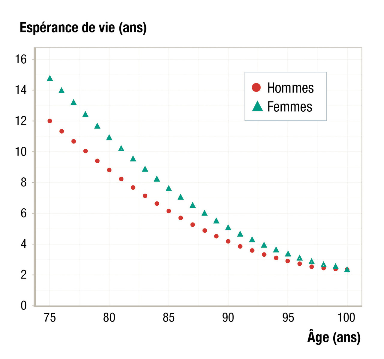 L’espérance de vie est le nombre moyen d’années de vie pour un âge donné. Elle est estimée par un calcul impliquant le taux de mortalité pour une population donnée, en fonction de tranches d’âge. En France, en 2015, selon les données de l’Insee, l’espérance de vie à la naissance est de 85 ans pour les femmes et de près de 80 ans pour les hommes. L’espérance de vie peut être définie à tout âge. Pour les femmes, elle est de 27 ans à 60 ans, de près de 11 ans à 80 ans et de 5 ans à 90 ans. Pour les hommes, elle est de 23 ans à 60 ans, de 9 ans à 80 ans et de 4 ans à 90 ans (