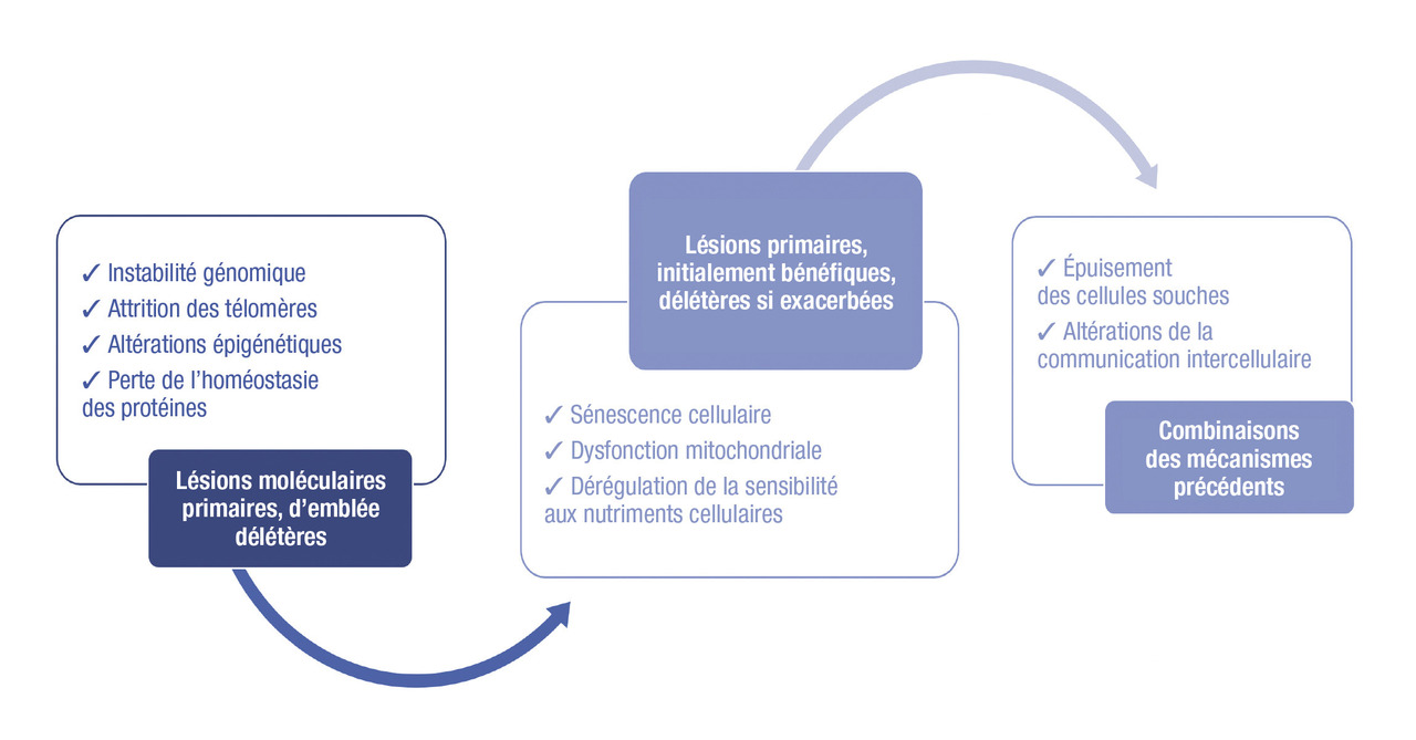 Les processus moléculaires entraînant le vieillissement sont des processus complexes et multifactoriels favorisés par des facteurs génétiques et environnementaux. Le vieillissement tissulaire est le résultat d’accumulation de lésions cellulaires au cours du temps.