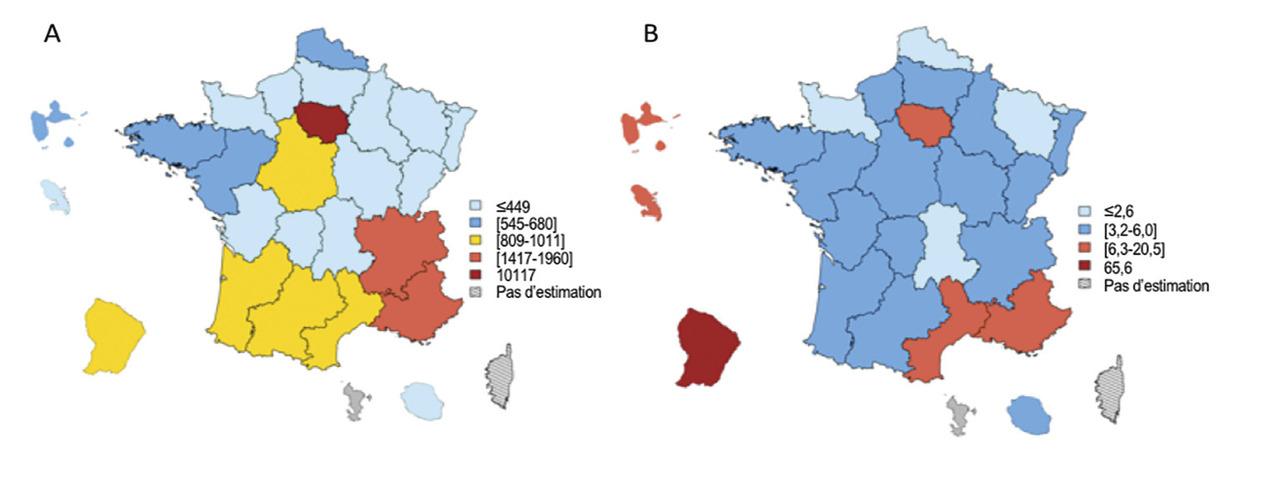 La proportion de tests positifs varie en fonction des régions (figure) : entre moins de 3 pour 10 000 pour la Basse-Normandie, l’Auvergne, la Lorraine et le Nord à plus de 13 pour 10 000 pour l’Île-de-France et les départements français d’Amérique, avec des valeurs intermédiaires pour les autres régions.