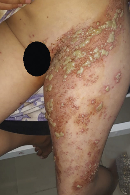 Le valaciclovir par voie orale (3 g/j pendant 7 jours) et des soins locaux par antiseptique ont permis un assèchement des lésions (
