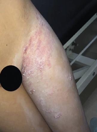 L’examen clinique objective des lésions vésiculeuses à contenu trouble, regroupées en bouquets, confluentes sous forme de bulles, reposant sur une peau érythémateuse ; leur disposition est métamérique, le long de la région lombofémorale gauche (métamère L4-L5) avec arrêt à la ligne médiane (