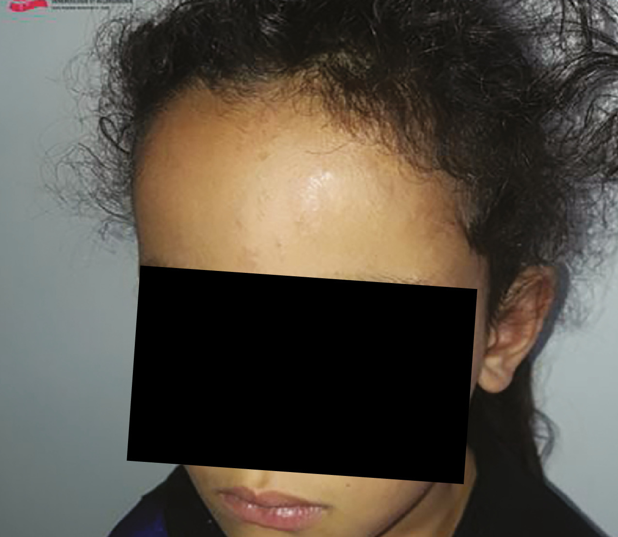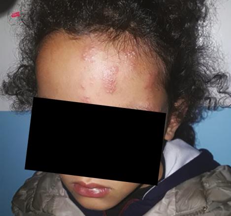 À l’examen clinique, l’enfant est algique, apyrétique, en bon état général avec, au niveau de l’hémifront gauche et du versant gauche du nez, de multiples vésicules groupées en bouquet surmontées de croûtes hémorragiques, reposant sur un fond érythémateux ; un œdème palpébral, une hyperhémie conjonctivale avec des sécrétions purulentes sont également constatés