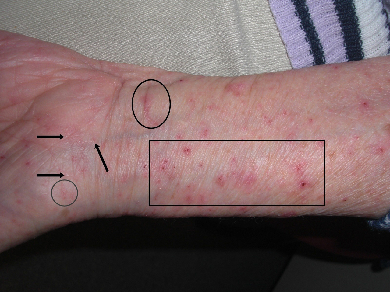 Vous êtes médecin généraliste en EHPAD et vous êtes appelé pour examiner Mme M., 94 ans. Cette patiente est atteinte d’une démence sévère et elle a un prurit diffus depuis 3 jours environ. Vous évoquez une gale commune.